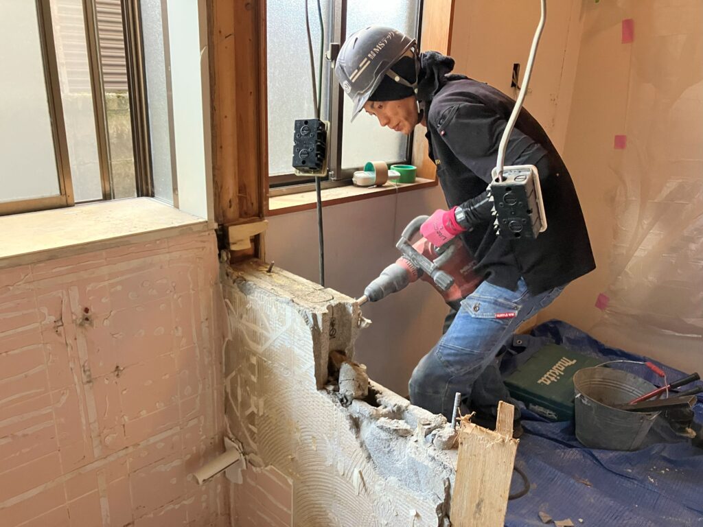 工事内容:経年劣化により、ユニットバスへ交換するためタイル風呂の解体。そして、ユニットバスの床を安定させるための土間打設を行いました。