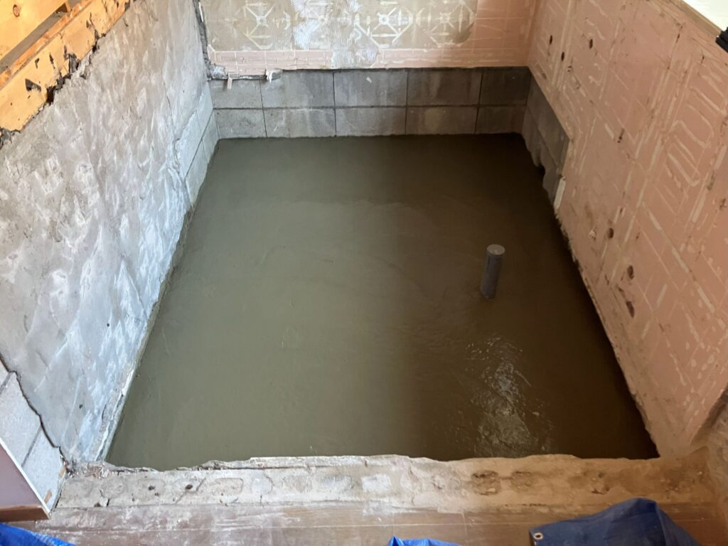 ユニットバスの設置後土間自体は見えなくなるものですが割れないようにワイヤーメッシュや差し筋をしっかり行い、打設後お客様に「綺麗な作業だ」と思ってもらえるよう金ゴテでしっかり均しました。