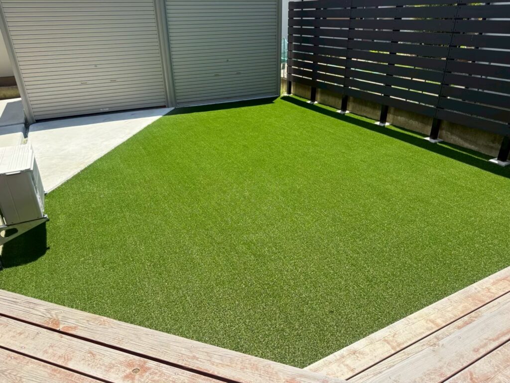 工事内容:庭の雑草が気になるのと子供のいる家のため転んだときの怪我を気にしており、人工芝の設置工事を行いました。